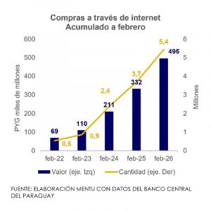 Las compras en internet, realizadas a través del Sistema de Pagos del Paraguay, alcanzaron 2,7 millones de operaciones en febrero, cantidad que significa un aumento interanual de 48,4%. El valor de las mismas totalizó PYG 248 mil millones (USD 38 millones), con una variación interanual de 50,4%.