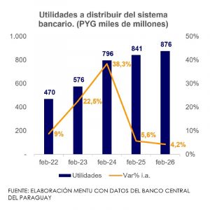 Las utilidades bancarias al mes de febrero ascendieron a PYG 876 mil millones (USD 136 millones), un nivel 4,2% mayor interanualmente, con lo cual se observó una recuperación con respecto a la baja interanual registrada en enero del 2026.