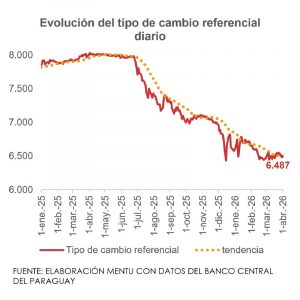 El tipo de cambio referencial del guaraní con respecto al dólar cerró el miércoles 01/abr en PYG 6.487/USD. La semana estuvo marcada por comportamientos mixtos en la cotización, predominando variaciones diarias negativas. Con respecto al cierre de PYG 6.528/USD de la semana previa, la cotización disminuyó 0,6%. En lo que va del 2026 acumula una reducción de 1,4%, lo que en parte estaría reflejando el mayor ingreso de divisas provenientes de exportaciones.