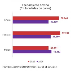 En marzo, se faenaron un total de 159.963 cabezas de ganado bovino, nivel 2,2% inferior al del mismo mes del 2025. Del total faenado en el tercer mes de corriente año, se obtuvieron 42.552 toneladas de carne, lo que representa un incremento interanual de 8,2%.