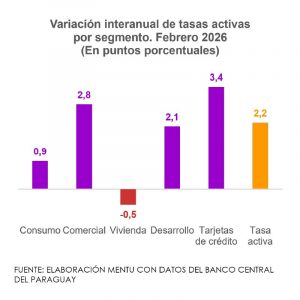 El promedio de tasas activas efectivas del sistema financiero se situó en febrero del 2026 en 16,3%. De manera interanual, aumentó de 2,2 puntos porcentuales (p.p.), un ritmo de crecimiento menor al registrado en el mes previo.