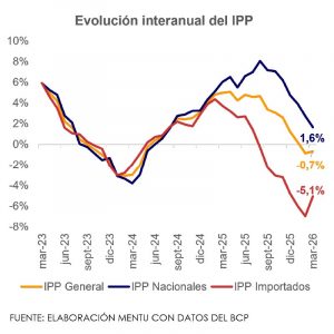 En el tercer mes del 2026, el Índice de Precios del Productor (IPP) registró una variación mensual de 0,9%, superior al 0,7% observado en igual mes de 2025. Con ello, la tasa acumulada se ubicó en 0,1%, por debajo del 2,0% registrado hace un año atrás, mientras que la variación interanual fue de -0,7%.