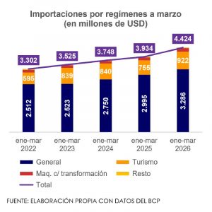Las importaciones paraguayas en el mes marzo tuvieron un valor de USD 1.706,7 millones y crecieron 29,6% interanualmente. Este incremento es el mayor observado desde abril de 2024, con incrementos pronunciados desde la segunda mitad del 2025, pese al debilitamiento del dólar. De esta manera, las importaciones acumuladas en el primer trimestre del año alcanzaron USD 4.423,6 millones, nivel 12,5% superior frente al del mismo periodo del 2025.