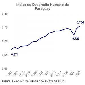 Paraguay enfrenta el desafío de convertir sus avances en desarrollo humano en bienestar más resiliente. Según los datos del Informe Regional sobre Desarrollo Humano 2025 del PNUD, el país alcanzó un IDH de 0,756 en 2023 y se ubicó en el puesto 99, con una esperanza de vida de 73,8 años y 14 años esperados de escolaridad.